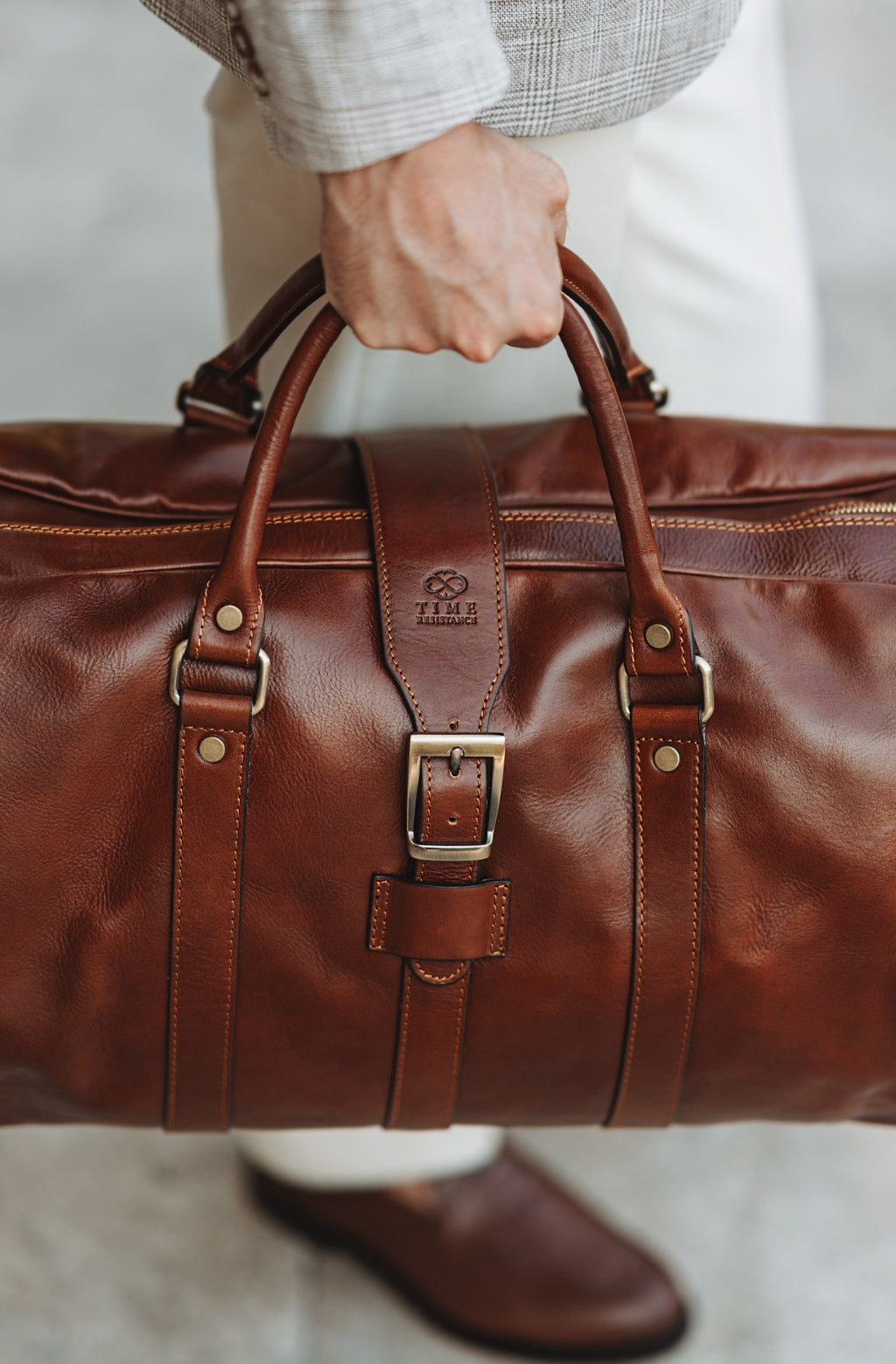 Time Resistance fertigt aus italienischem Vachetta-Vollnarbenleder, pflanzlich gegerbt und von Hand gefärbt. Mit der Zeit entsteht eine edle, unverwechselbare Patina.